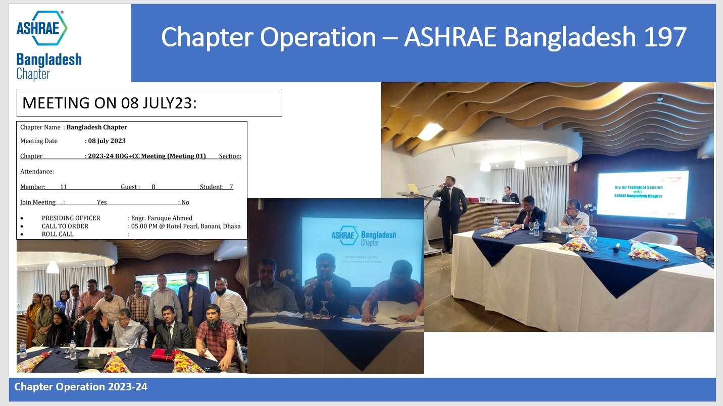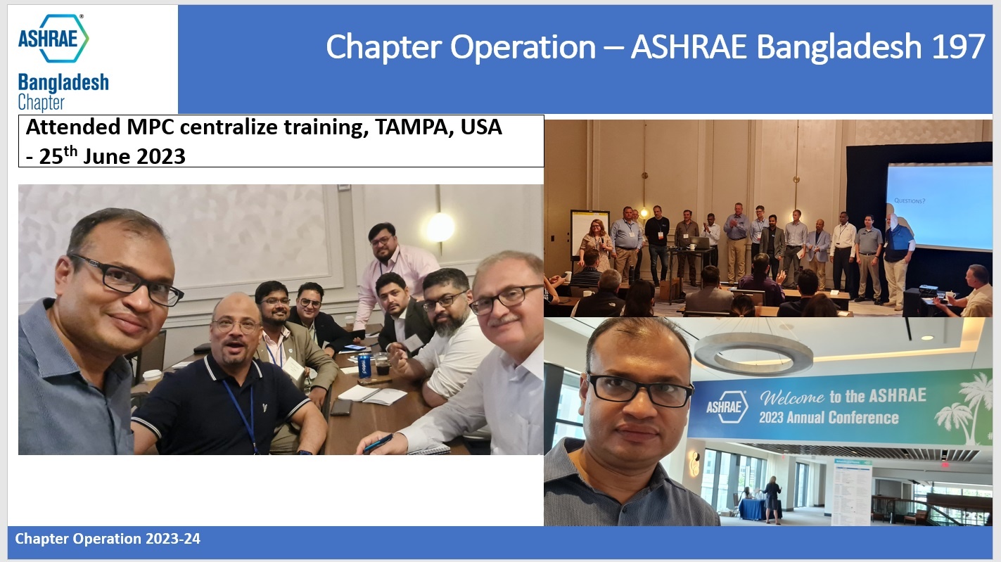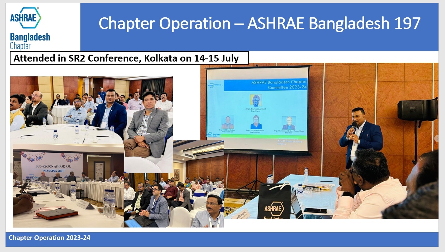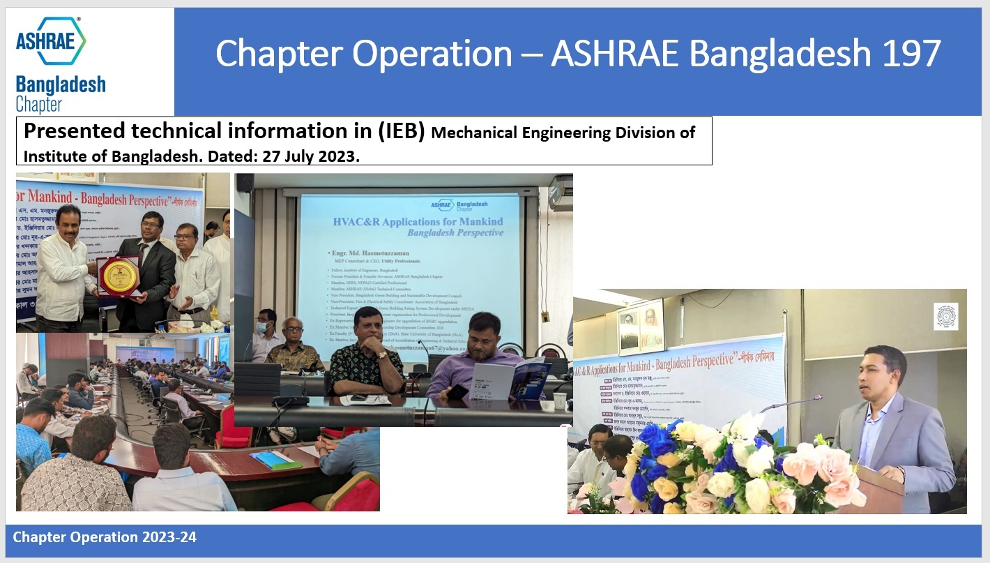 ASHRAE Bangladesh Chapter News And Events ASHRAE Bangladesh Presented technical information in (IEB) Mechanical Engineering Division of Institute of Bangladesh. Dated: 27 July 2023. Read More ASHRAE Bangladesh Attended in SR2 Conference, Kolkata on 14-15 July Read More ASHRAE BANGLADESH MEETING ON 08 JULY23. Read More ASHRAE Bangladesh Chapter Attended MPC centralize training, TAMPA, USA- 25th June 2023 Read More Bangladesh Attended in ASHRAE RAL CRC 2022. Read More BD TALKS-ASHRAE BANGLADESH CHAPTER NEWSLETTER 2022. Read More Monthly Meeting And Technical Seminar (Dynair) 6th Sep 2022 Read More TECHNICAL TOUR of ASHRAE Bangladesh Chapter, arranged for Student Branch of AUST Read More ASHRAE Discussion and Joining Seminar on Armacel 26th August 2022. Read More 1 2 3 Next »